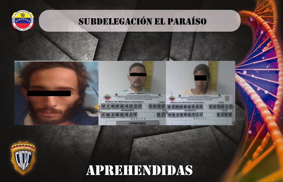 Funcionarios del Cuerpo de Investigaciones Científicas, Penales y Criminalísticas (CICPC), adscritos a la subdelegación El Paraíso, lograron aprehender a dos hombres y una fémina solicitados por homicidio en el municipio Libertador de Caracas, Distrito Capital.