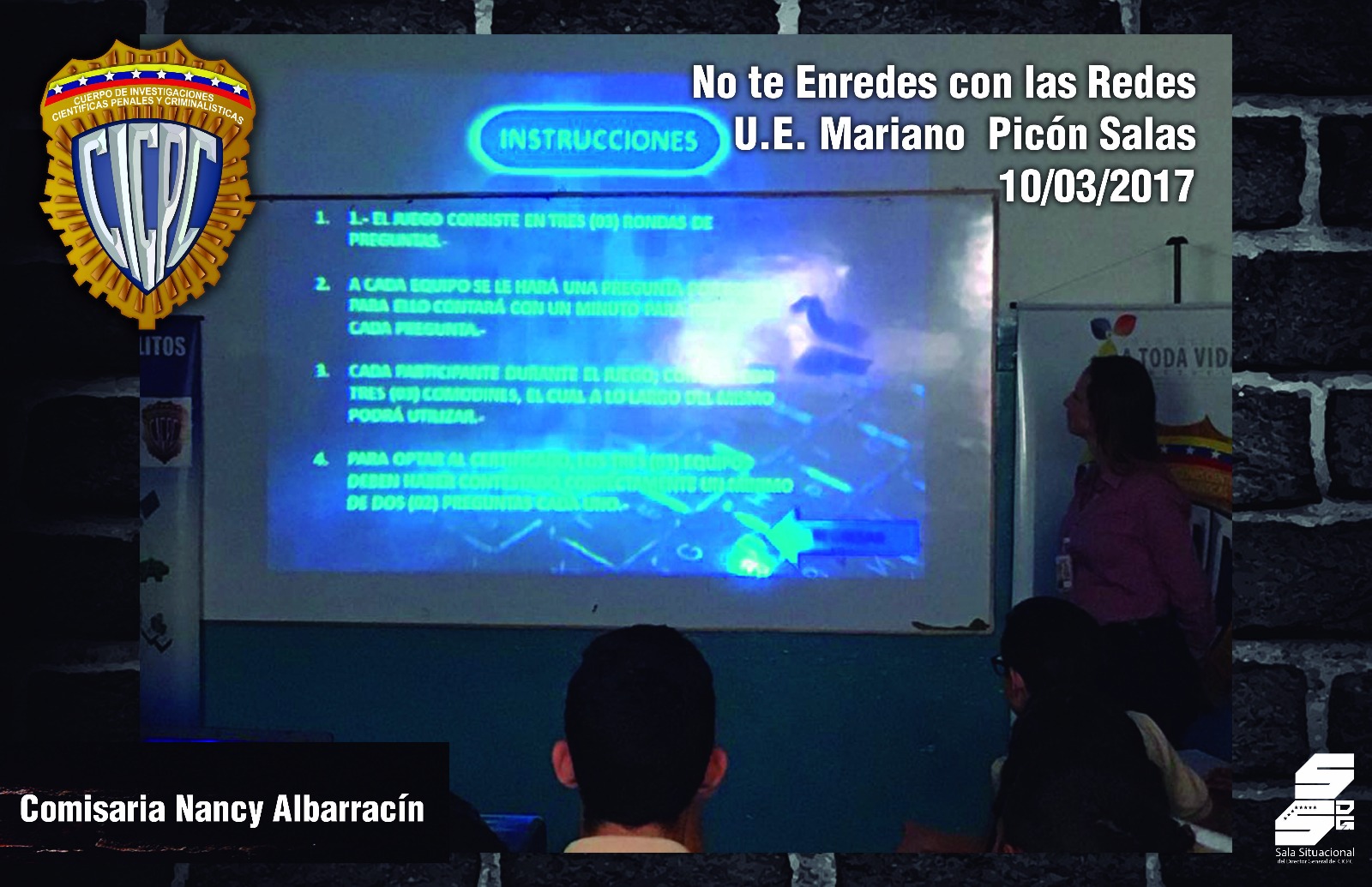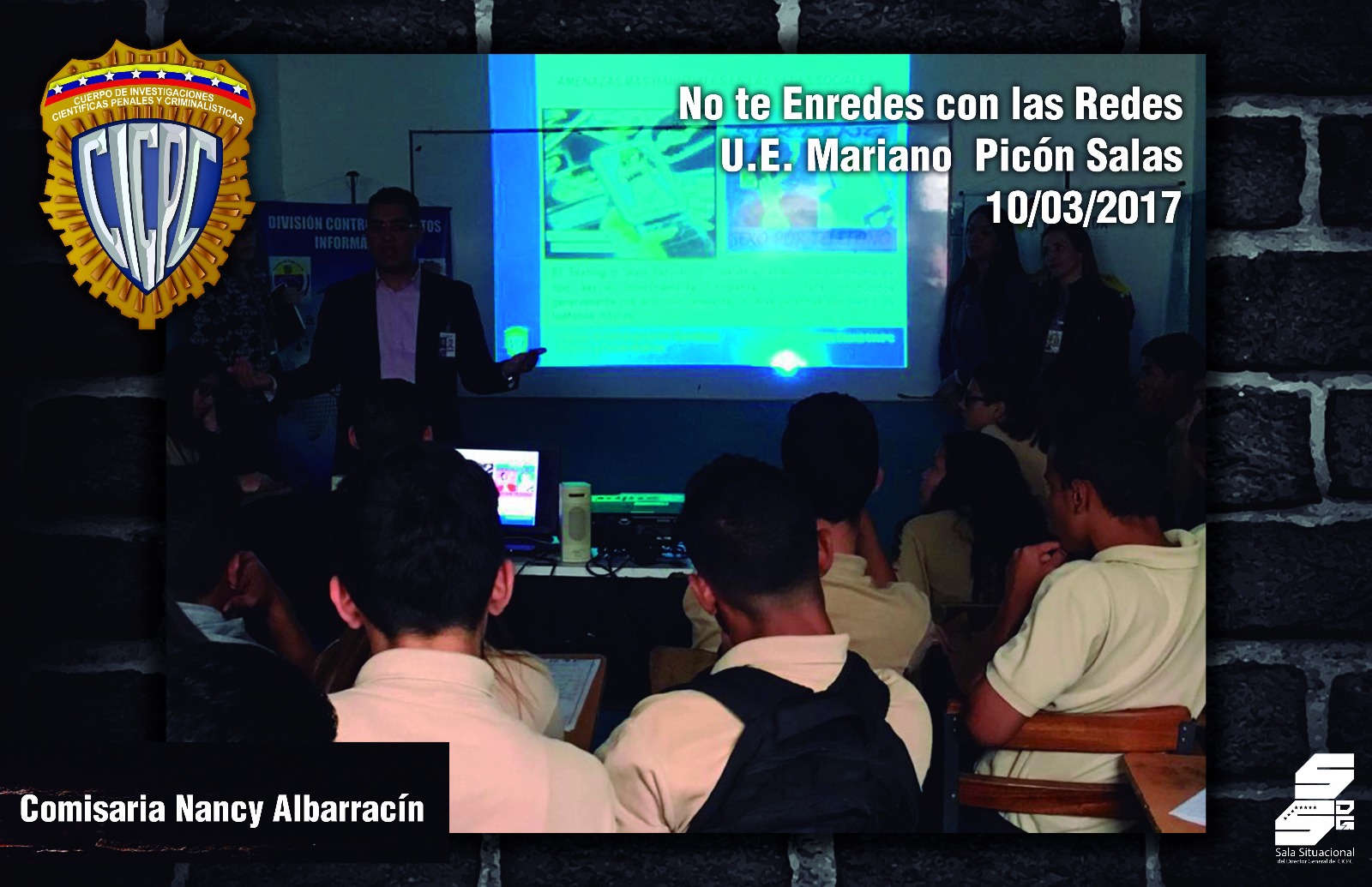 Más de 50 estudiantes del Colegio Mariano Picón Salas, ubicado en la calle 2, Montalbán del municipio Libertador del Distrito Capital, recibieron la charla “No te enredes con las redes”, dictada por los funcionarios del Cuerpo de Investigaciones Científicas, Penales y Criminalísticas (Cicpc), adscritos a la División contra los Delitos Informáticos.